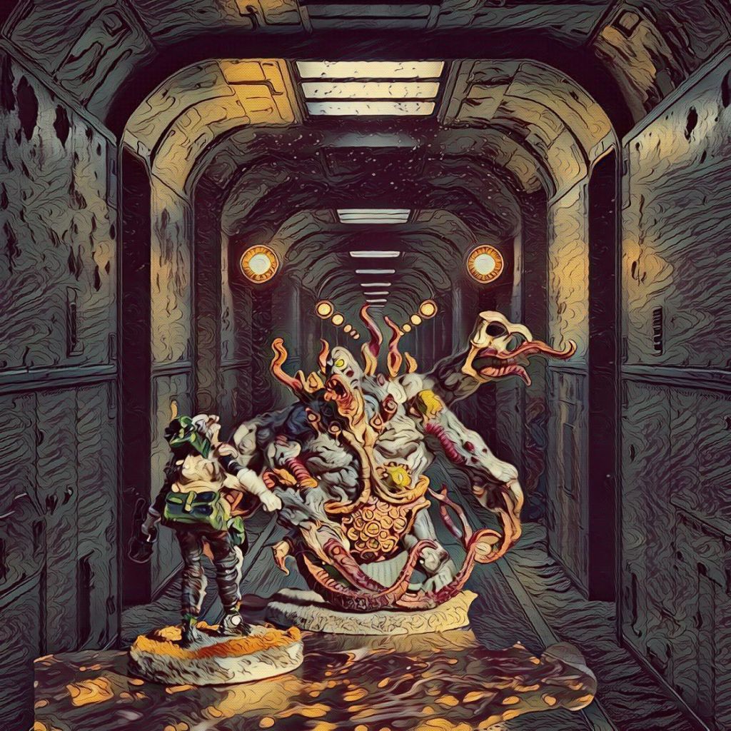 The stations emergency lighting kicked in, flooding the corridor with a sickly orange glow that revealed the monster towering before her. She no longer stared into an abyss, for that had been torn away by a towering bulk of grey flesh, pockmarked with pustules of foetid growths oozing with decay. The beast looked upon her and roared, raising clawed hands and razor barbed tentacles of pink and purple flesh stained in crimson blood.